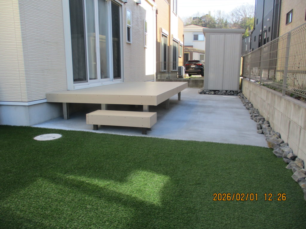 中庭の改修工事として、人工芝張り、コンクリート打設、ウッドデッキを施工しました。