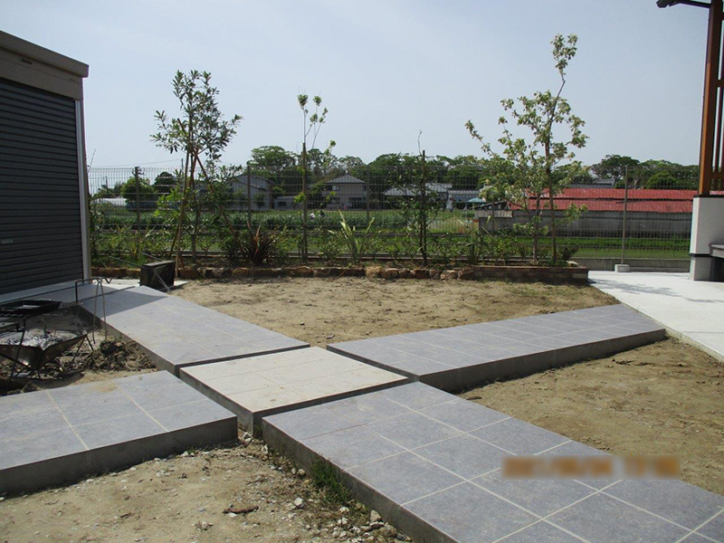 また、中庭部分はタイル貼りの変形アプローチを設け、お庭と建物の繋がりを意識しました。