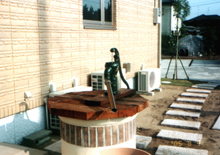 お庭に温水シャワー付けました、木目調でお庭に馴染みます