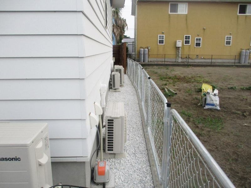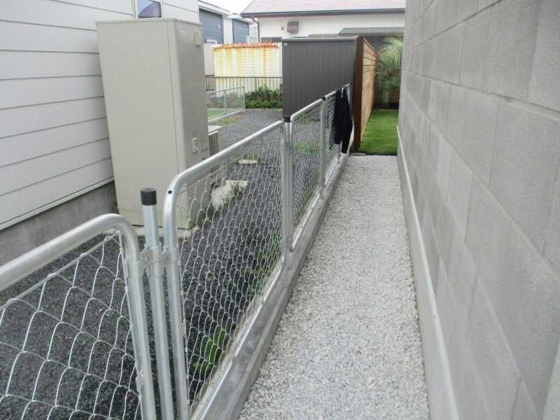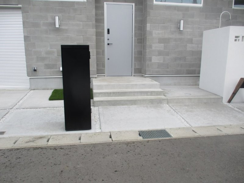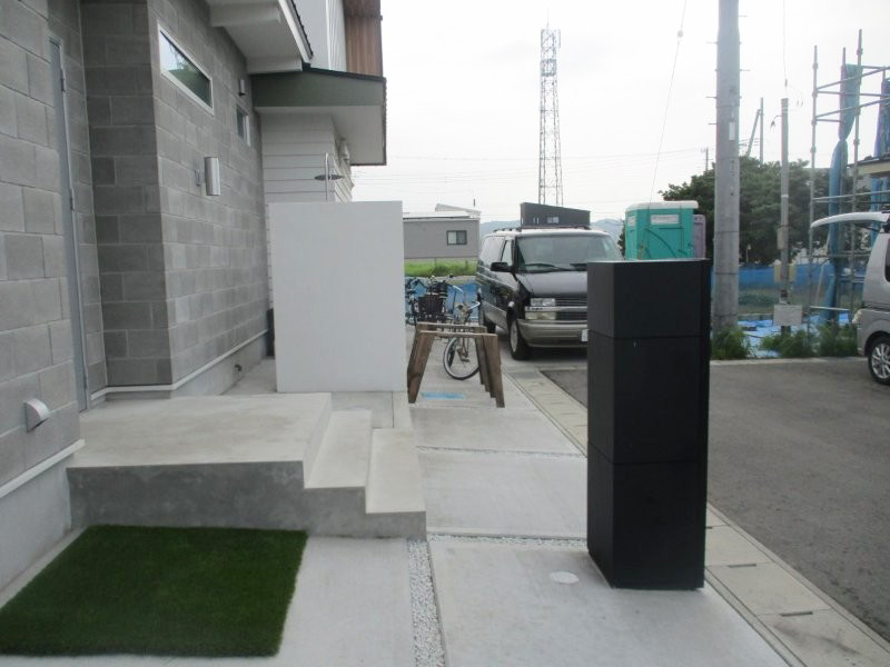 花ブロックをアクセントにした真っ白な門袖でシャワー隠しています。