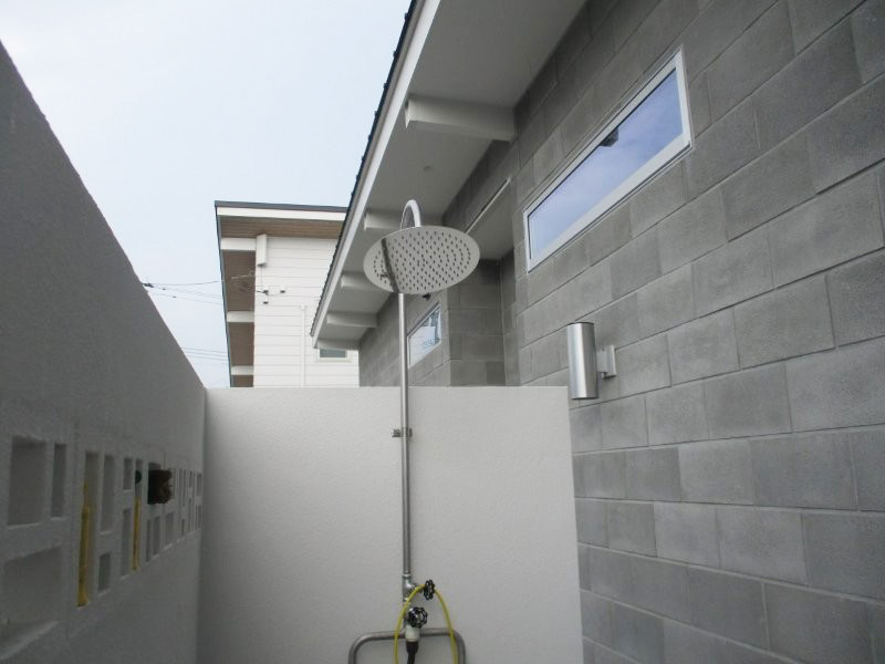 ファサードにシャワーがあるシックなサーファーズハウス。