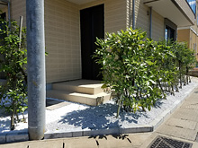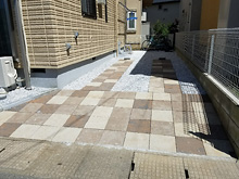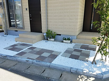 アプローチから車庫スペースには、3色の平板を使用し、デコラティブに仕上げました。