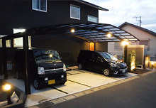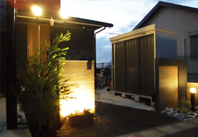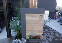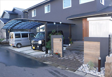 木目調タイル貼り×ジョリパット仕上げの門柱と足元の自然石風な舗装材がお洒落に調和しています。