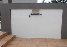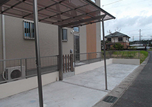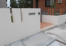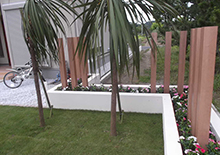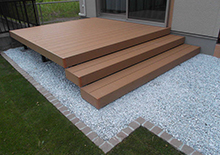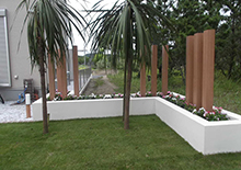 モダン住宅とコーディネートしやすい天然木さながらのお色を門灯、庭園灯、木調柱、デッキに使用しました。