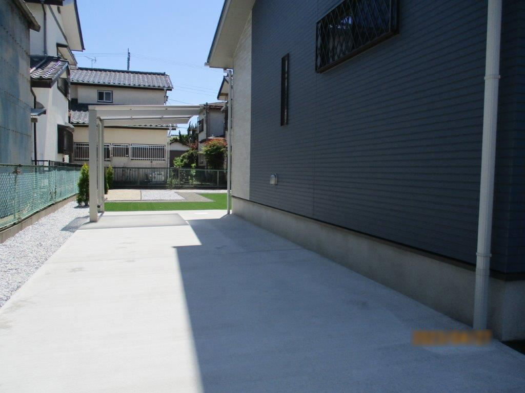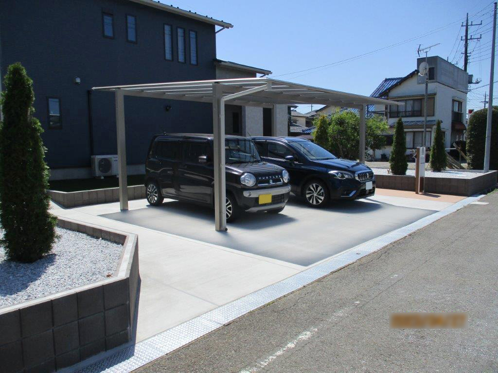 スロープのアプローチ、カーポート付き駐車場、サイクルポート、