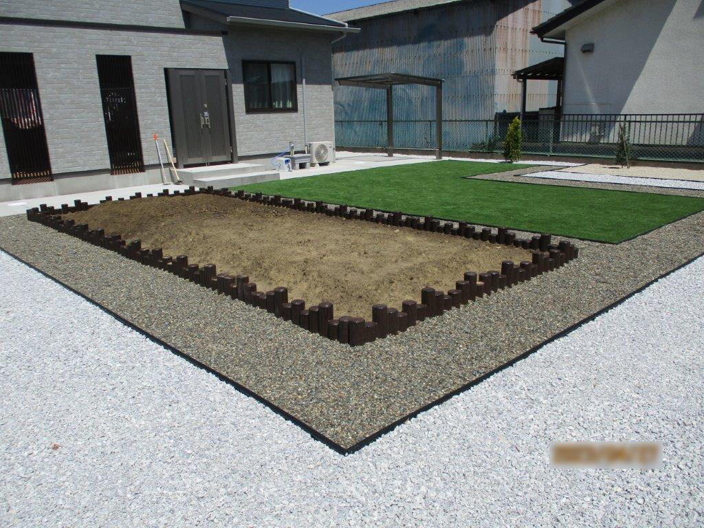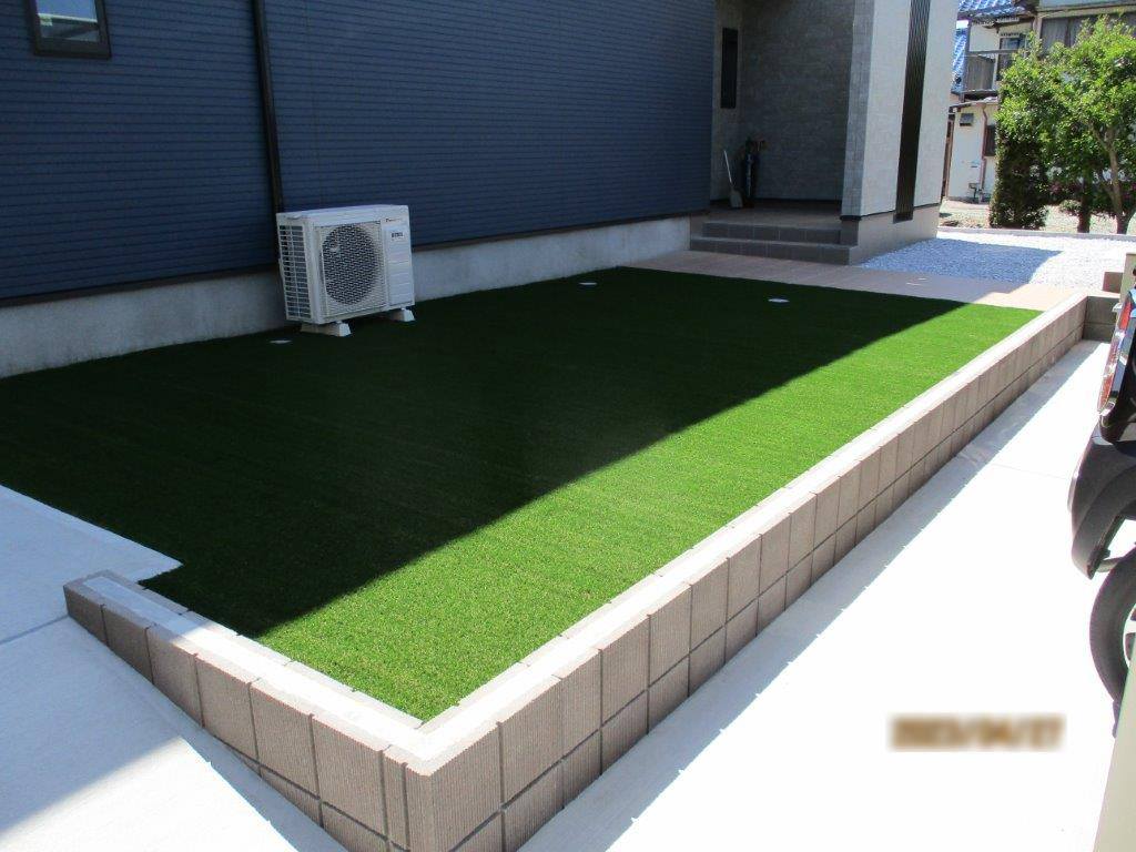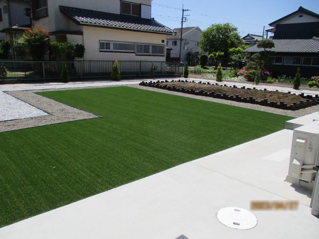 豆砂利を敷き込み、人口芝で仕上げました。