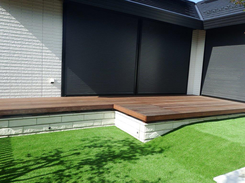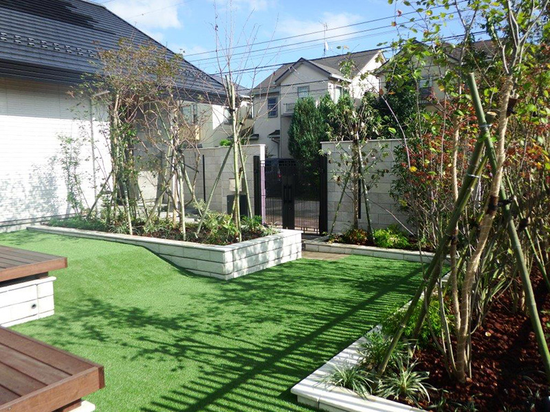 中庭は人工芝張り、ウリン材のデッキ、岩肌が美しいブロックで花壇を立ち上げ、ナチュラルでみずみずしい仕上がりに。