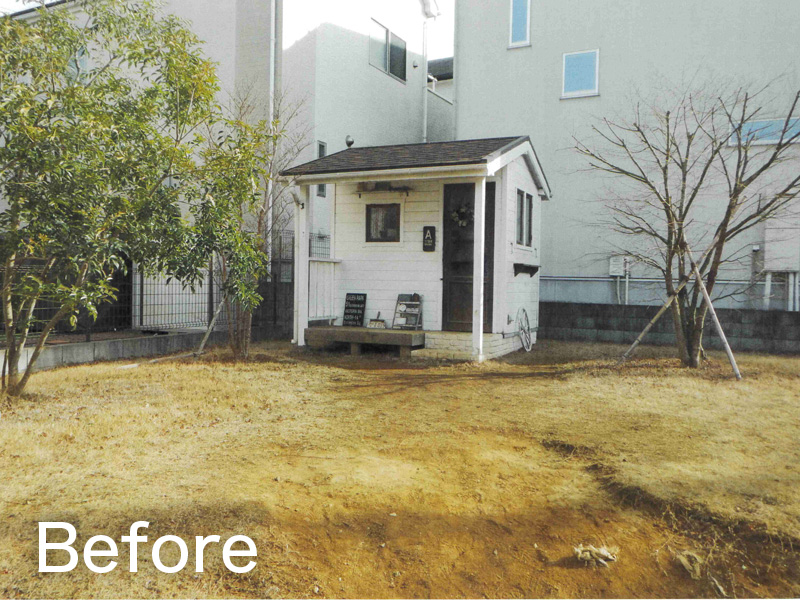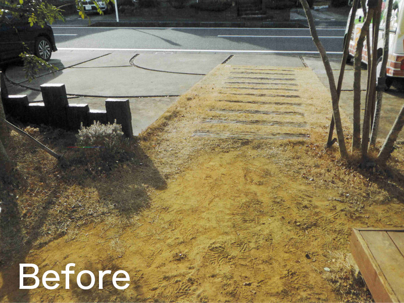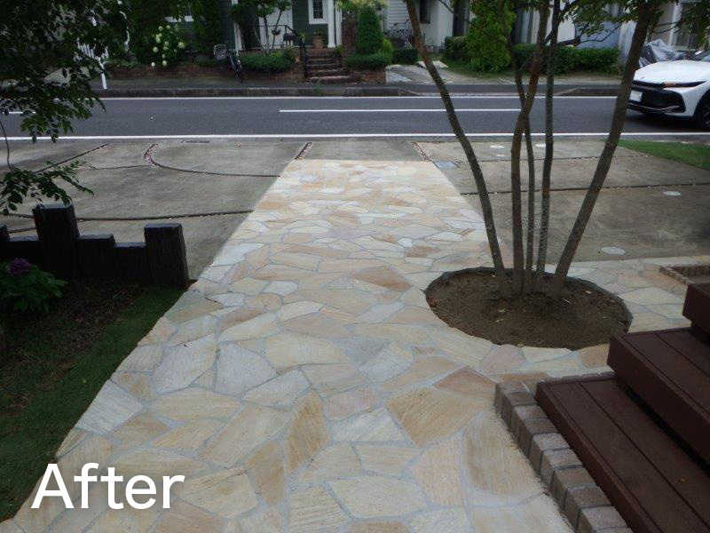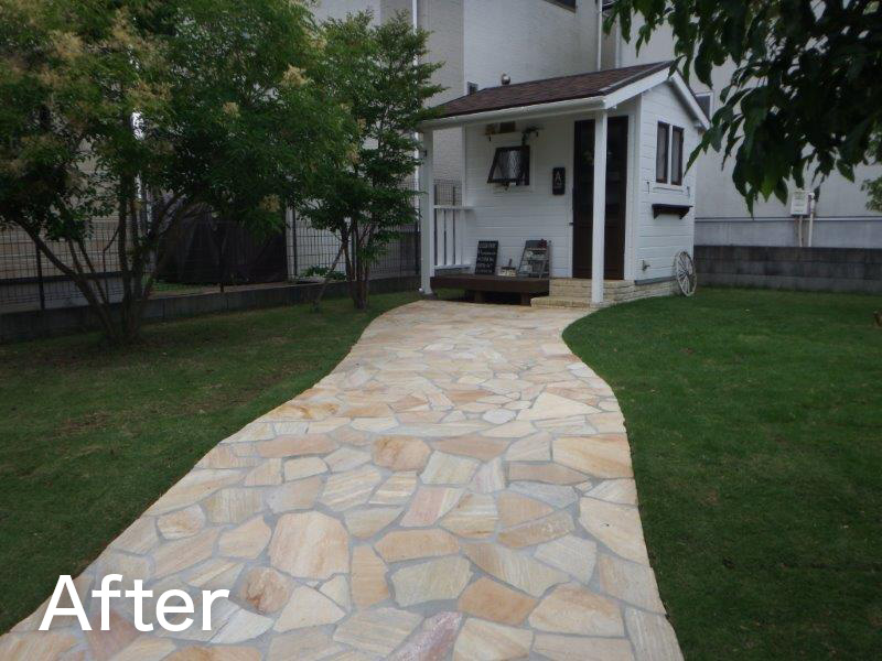 自然石のアプローチ、芝の張り替えでナチュラルな仕上がりになりました。