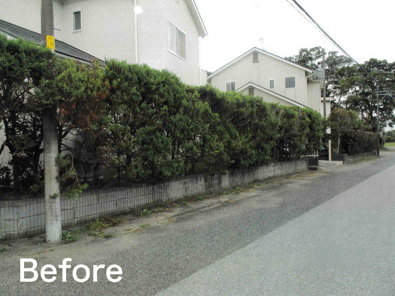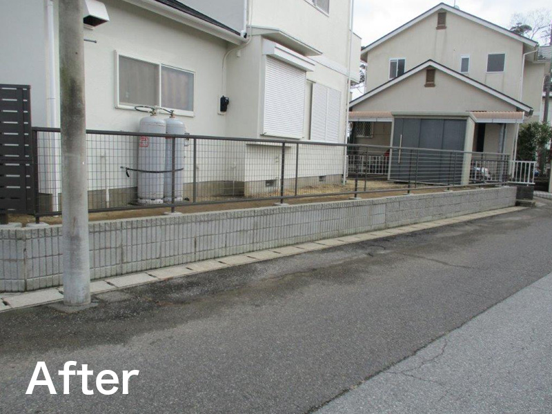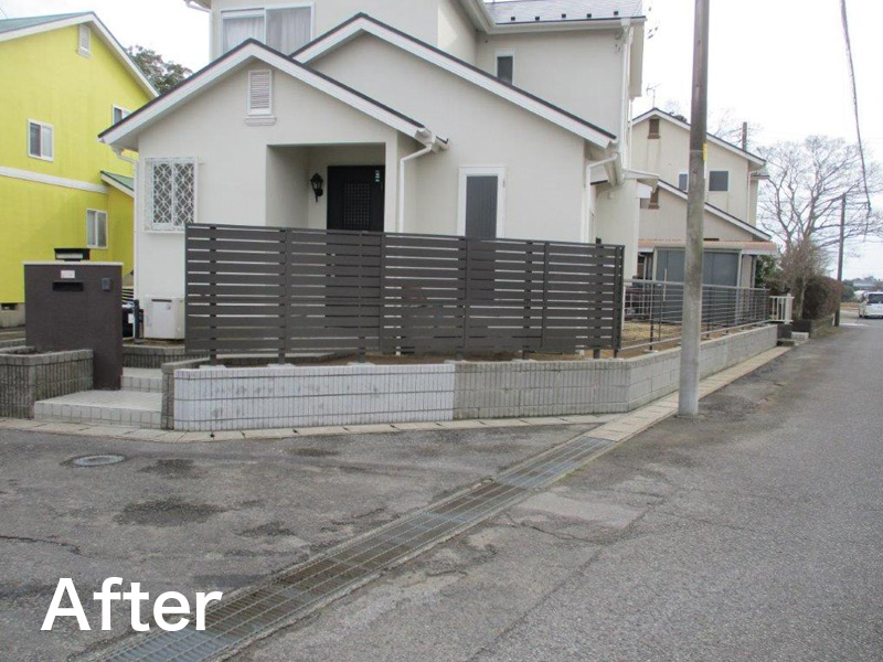 大きく茂った生垣を撤去し、ブロック土留増設、玄関前は目隠し用途のフェンスへ、道路側はメッシュフェンスにやり替えました!