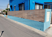 フェンスとオーバードアは同系色で統一し、塗り壁( ジョリパット)の思い切ったカラーリングでお洒落にセンスUP!