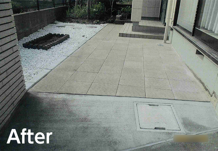 ミカゲ石畳を解体撤去し、新たに300角平板を敷き込みました。