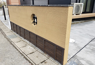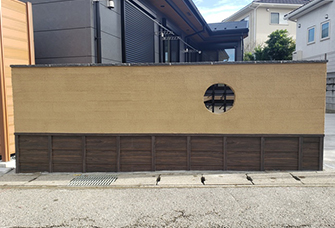 柔らかいからし色の飾り塀がお家の顔になり、丸窓に井桁格子、塀の下部にささら子下見板で和の装いをご提案しました。
