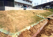法面の芝生による土留めと側溝の施工