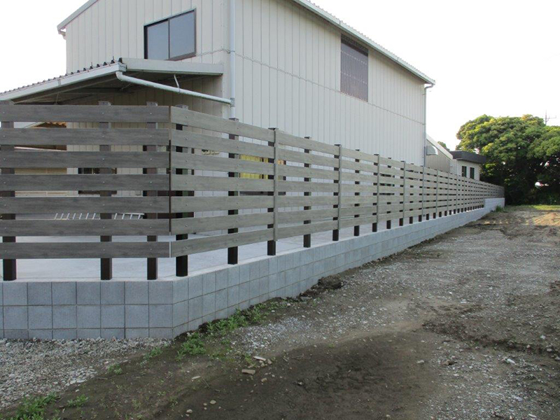 土留工事を主とし、建物まわりに犬走り打設、目隠しフェンスを施工しました。