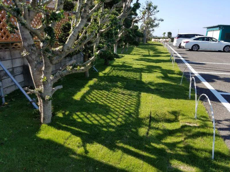建物周りに花壇を造り、植え込み内は芝地で仕上げました。