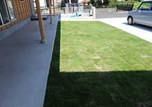 細部に五色砂利を用いました。そして、天然芝と土間が整然と目に映ります。
