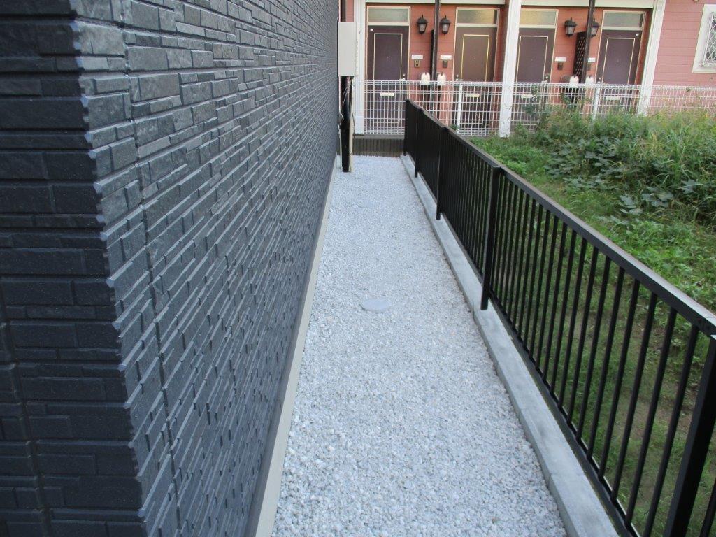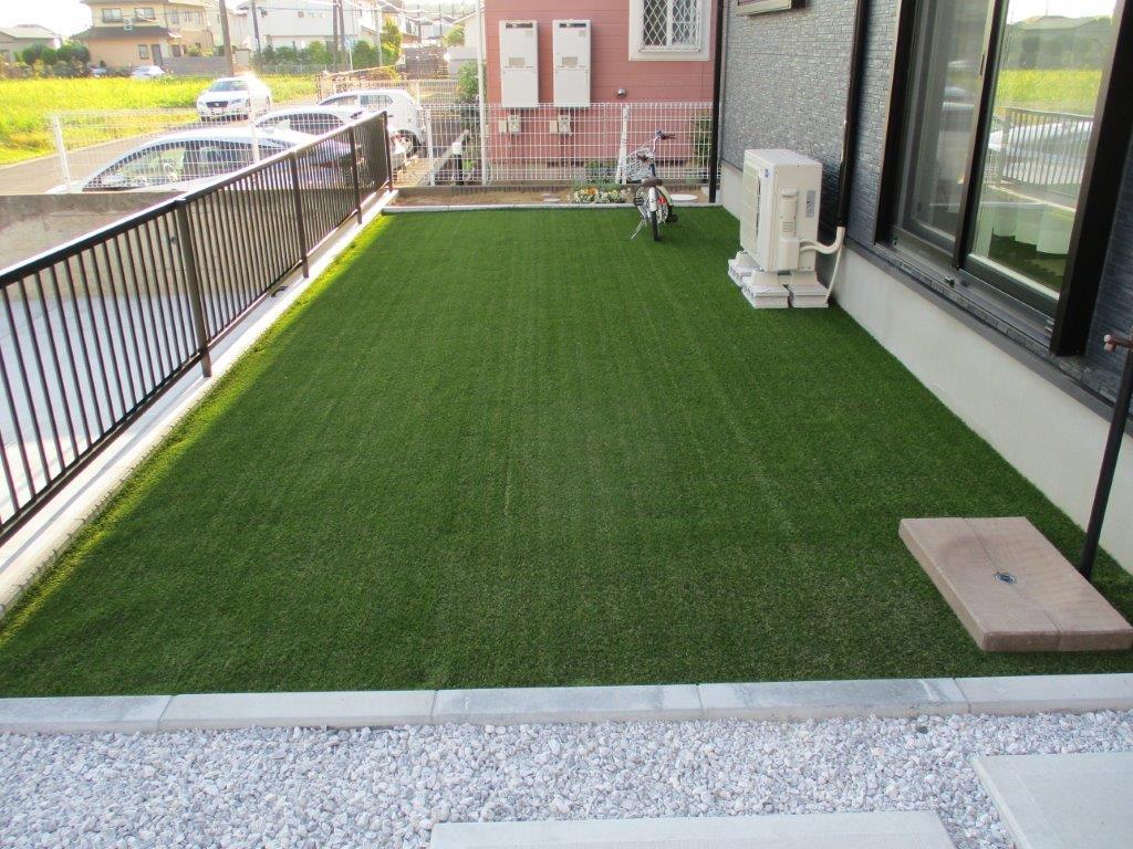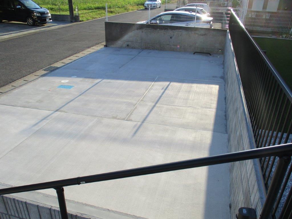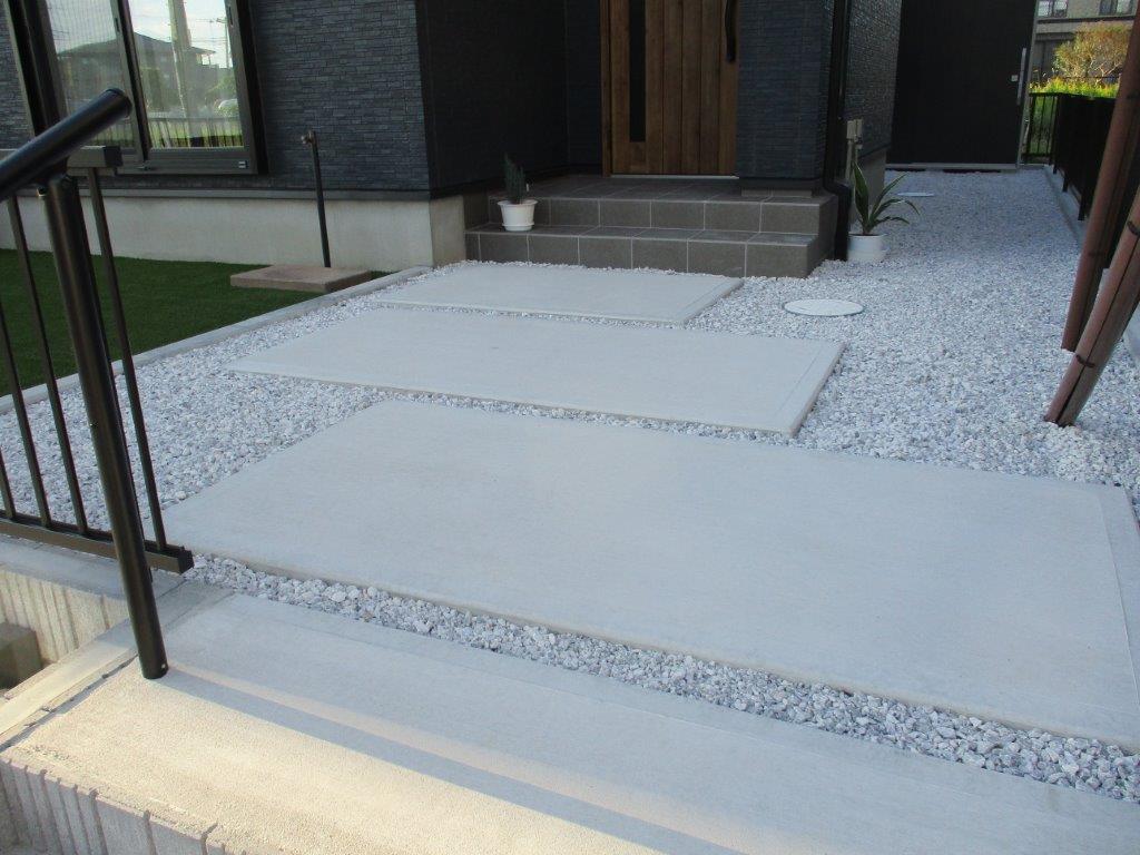 広々としたコンクリート駐車場、階段アプローチ、中庭は人工芝で仕上げました。