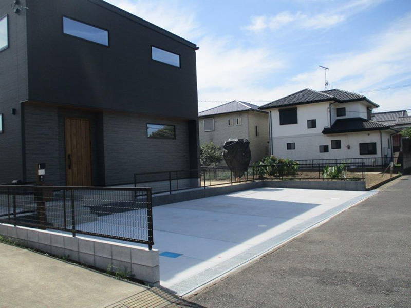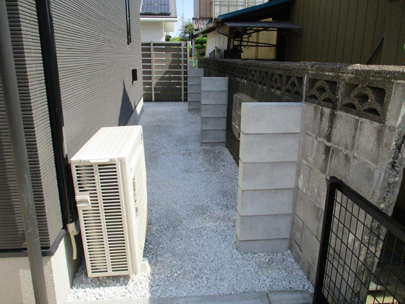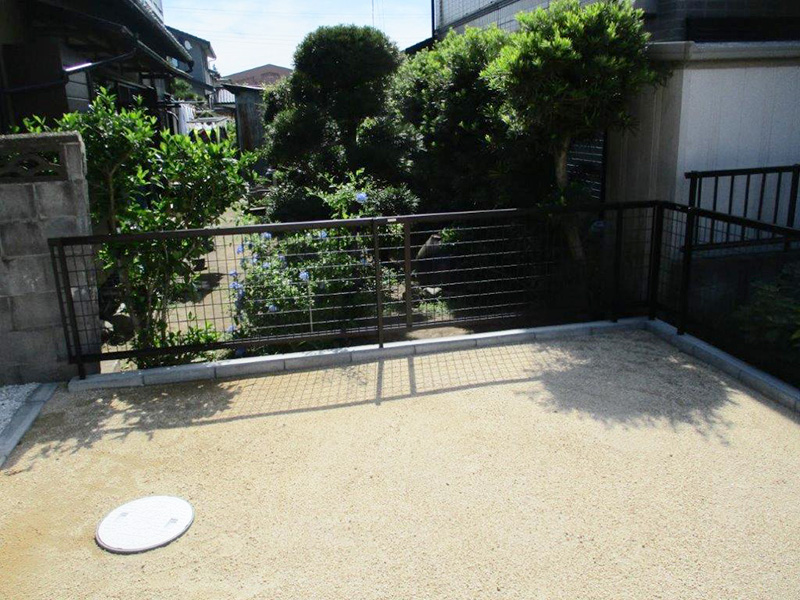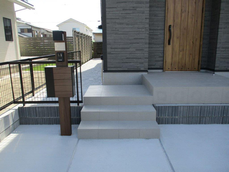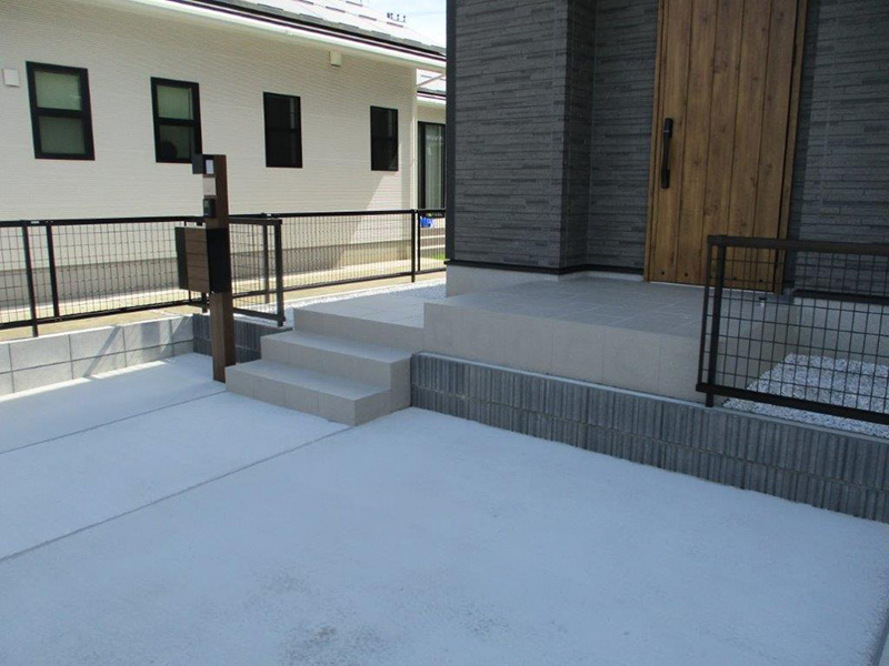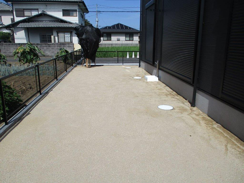 玄関まわりは機能門柱、建物まわりは石灰砕石敷き、中庭は岩瀬砂敷きとなっています。