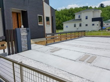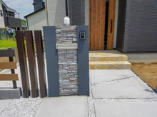 上品なカラーの建物と色味を合わせてシックな印象にまとめました。ポイントに使用した木目調のエクステリアが空間を柔らかく繋ぎ、門柱の自然石が高級感を醸し出しています♪全面に広々した駐車スペースを設け、機能面も考えました。