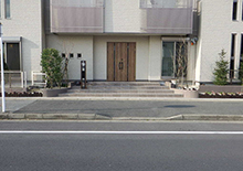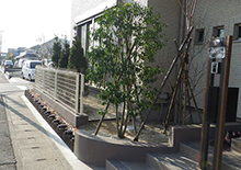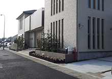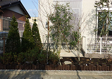 また、杉皮擬木と薄こげ茶の低い塀をモチーフに、さり気無い雰囲気を演出致しました。たくさんの地被植物が宿している為、新緑が楽しみです!