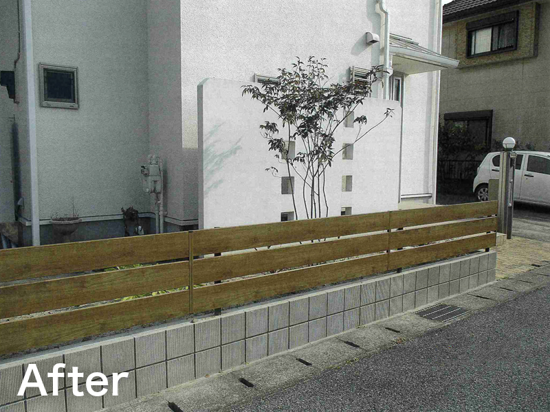 枕木の土留めから、新規ブロック積み+フェンスにリフォームしました。