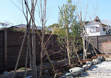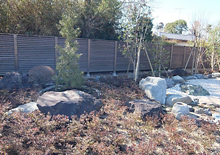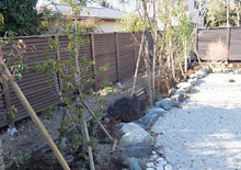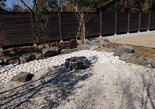 新筑波石を中心に群馬県の青石で縁取りをし、池水を用いずに山水の風景を表現しました。