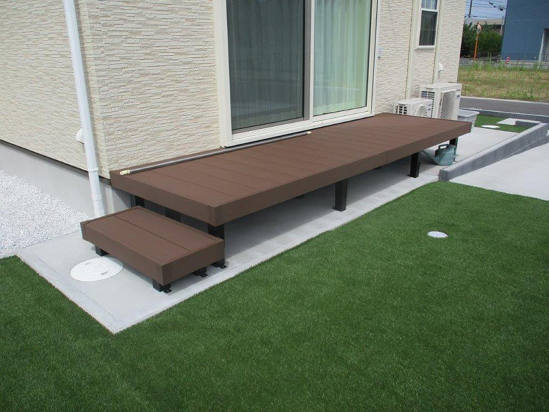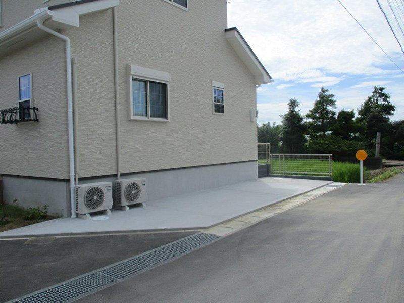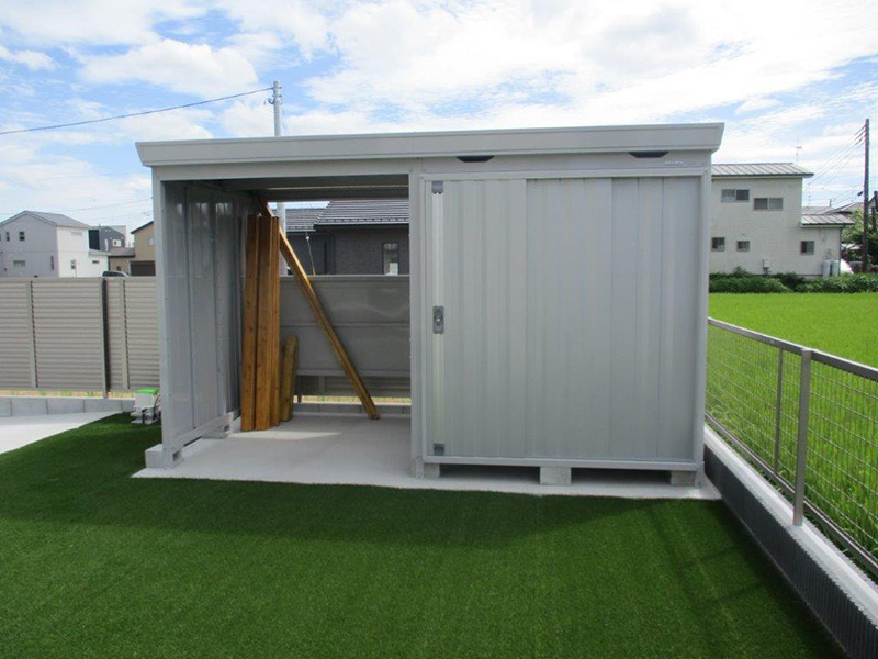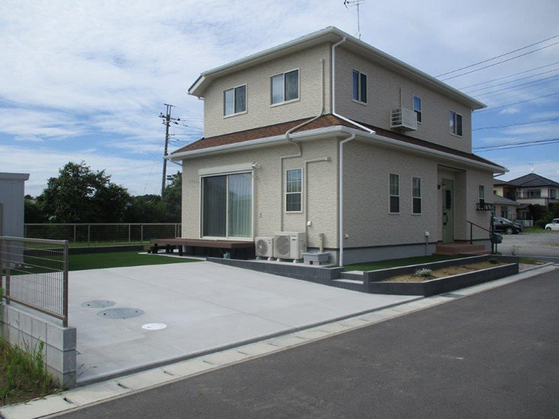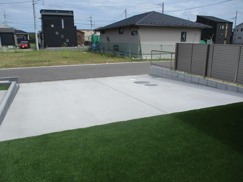 広々としたコンクリート駐車場と物置スペース。中庭は人工芝とウッドデッキ。