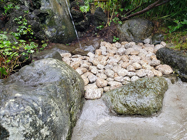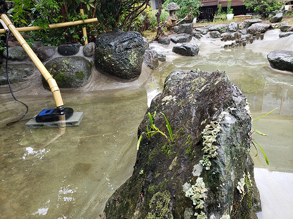 ⑦再度、満水にして、水質浄化栄養バクテリア液を投入し、池の水を循環させて完了。