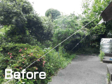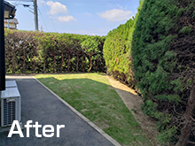 大きく茂ってしまった庭木を伐採抜根処分し、明るい陽ざしの降り注ぐ、芝生のお庭にリガーデンしました。