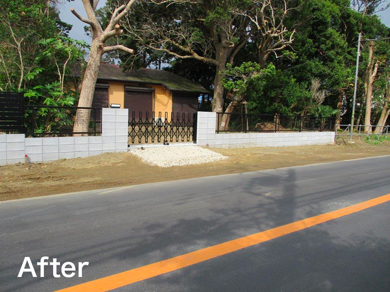 既存塀の解体、樹木の伐採抜根から始まり、道路が広くなる分を後退させて、新設ブロック積み+フェンス+伸縮門扉でおさめました。