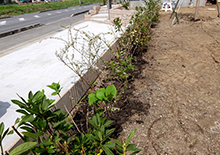 「ユキヤナギ→レンギョウ→ヒューガミズキ→ヒラドツツジ→アジサイ」のパターン化の植え込みです♪